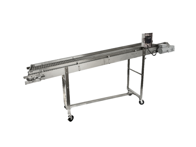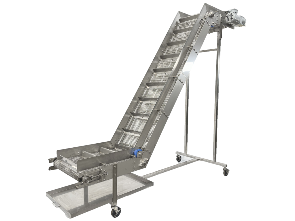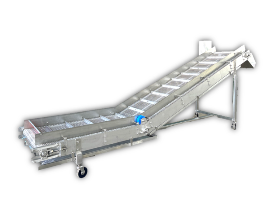 ベルトや網に取り付けられるヨコ桟は、傾斜搬送時の商品の落下を防ぎ、高さも変更可能です。