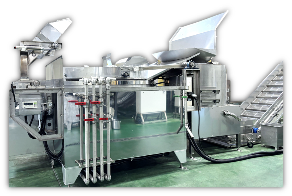投入・フライ・振り切りの各工程時間を細かく調整できるため、商品に合わせた無駄のない効率的な生産を実現します。浅鍋構造により油の劣化を抑え、品質の安定とコスト削減に貢献します。